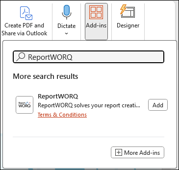 A list of add-ins appears. - In the Search box, type Reportworq.