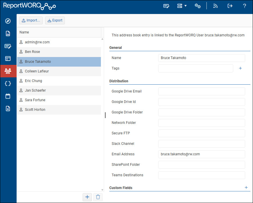 The Address Book contains data related to contacts, including specific distribution settings and custom parameters. Enabled user accounts that have Authentication Credentials are automatically listed as contacts in the Address Book. Contacts for users who do not need to log in to Reportworq, such as consumers of distributed reports, can be created, edited, or deleted directly in the Reportworq Address Book. Contacts can be reused for multiple jobs, which simplifies the configuration of distribution targets.