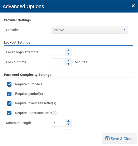 If Reportworq is using Native security, as it does by default, new users will log in the same way you did earlier — by using a blank password and then updating it with a new password upon first login. By selecting the Authentication Provider button on the toolbar, you can access the Advanced Options, where you can switch Reportworq from Native security to using a single sign-on provider such as Microsoft Entra. You can also specify the password complexity requirements.