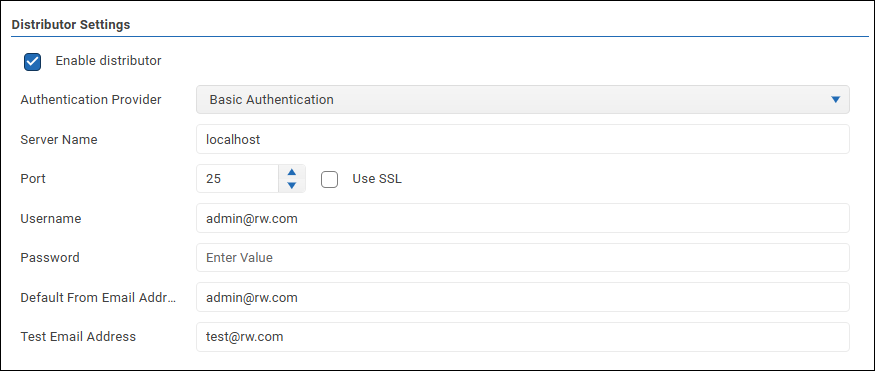 For the Email distributor, in our example we’ll use a local SMTP server for email. Set the server name, port number, and the address from which Reportworq will send emails. Save your settings and test your connections before proceeding.