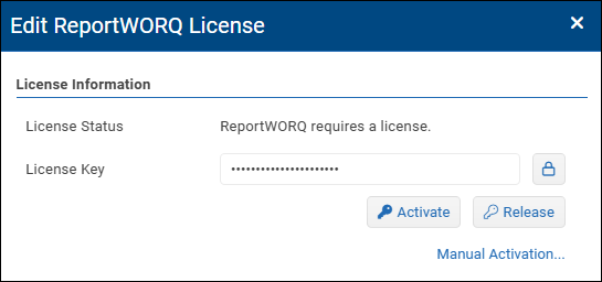 If the Reportworq server is unable to contact the licensing server for activation, a manual activation may be required. Select the Manual Activation button and follow the on-screen steps.