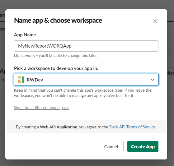 - Provide a name for the new App and select the Slack workspace for report distribution.