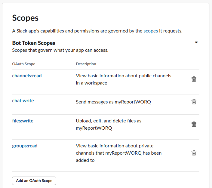 - In the Bot Token Scopes section, select the Add an OAuth Scope button.