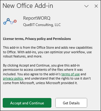 - If the add-in is not installed, you are prompted to Accept and Continue, and then you are prompted to log in to Reportworq.