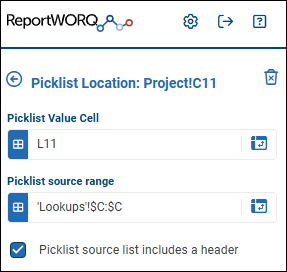 - Select Picklist source contains a header if you do not want to the first value from the Picklist source range to be included in the picklist.