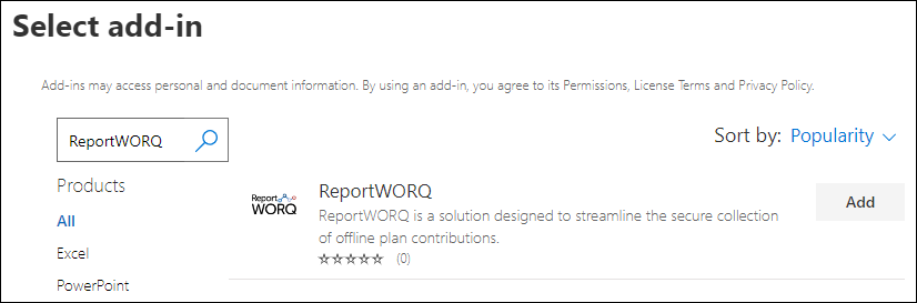 - Use the Search box to find the Reportworq add-in, and then select Add.