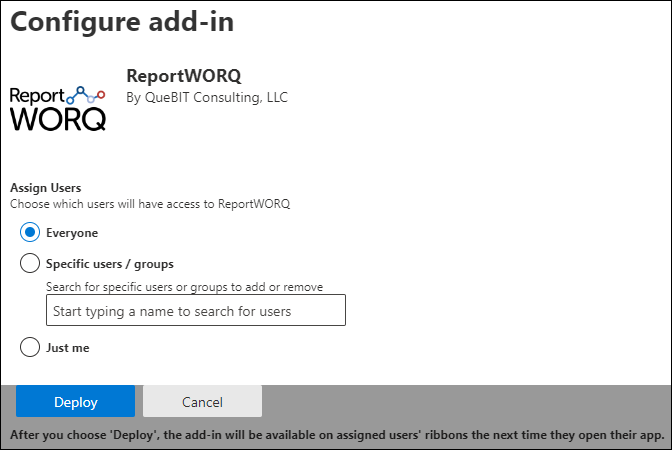 - Specify which users will have access to the add-in, and then select Deploy.