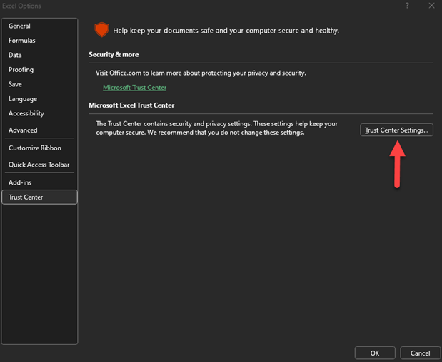 - From the left menu, select Trust Center, and then select Trust Center Settings.