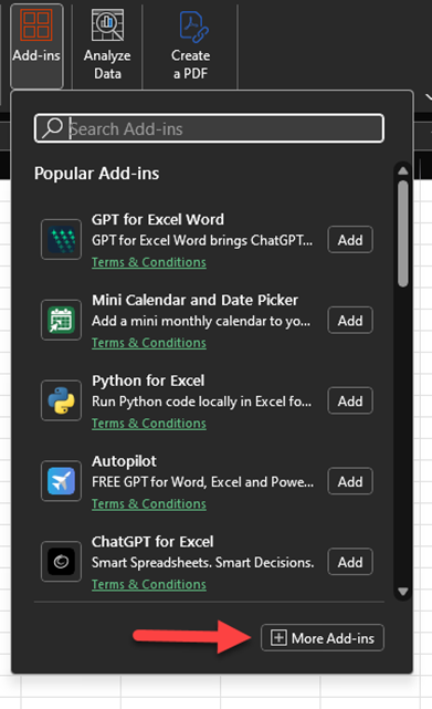 - On the Home tab, open the Excel ribbon and select Add-ins > More Add-ins: