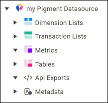 - The reporting model for a Pigment datasource includes nodes for Dimension Lists, Transaction Lists, Metrics, Tables, Api Exports, and Metadata.
