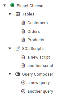 In this example, the Tables node lists all data tables that users have imported from the datasource. Nodes for the SQL Scripts tool and the Query Composer tool list all scripts and queries created by users.