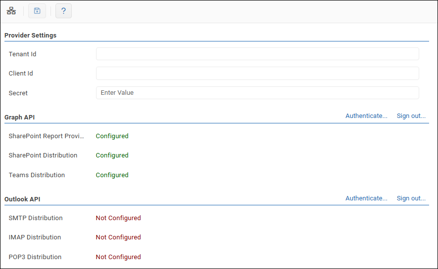 - After authentication, confirm that the SharePoint Report Provider item under the Graph API section shows as Configured.