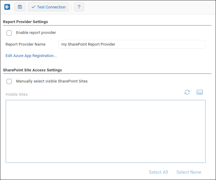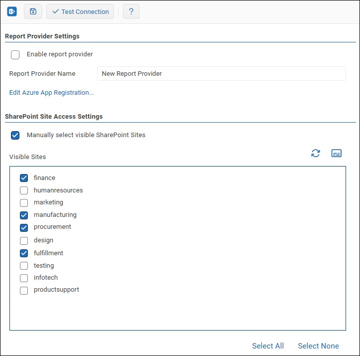 - In the list on the left side of the browser window, select your SharePoint Report Provider to return to the Report Provider configuration interface.