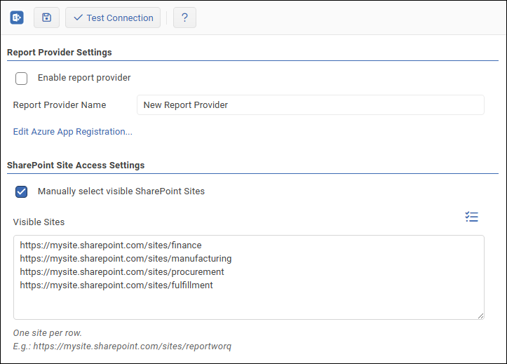 This name is visible to Reportworq users when they select source reports for Distribution Jobs. The name of each Report Provider must be unique. - If you want to specify which SharePoint sites are visible to Reportworq users, do the following: